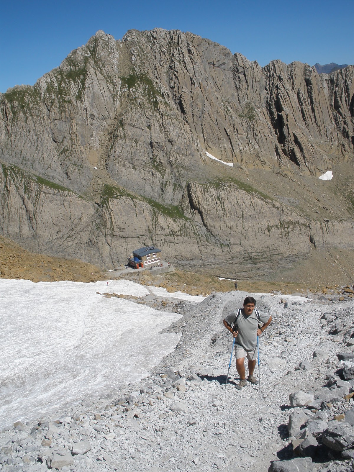 Nos dirigimos ahora hacia la brecha cruzando un pequeño glaciar y vemos lejos el refugio conforme vamos subiendo.