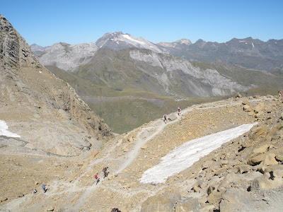 Nos dirigimos ahora hacia la brecha cruzando un pequeño glaciar y vemos lejos el refugio conforme vamos subiendo.